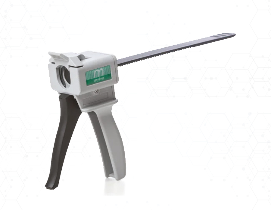 Le modèle MYLVA GUN est fabriqué entièrement en plastique et intègre une tige crantée associée à une chambre d'isertion de la cartouche