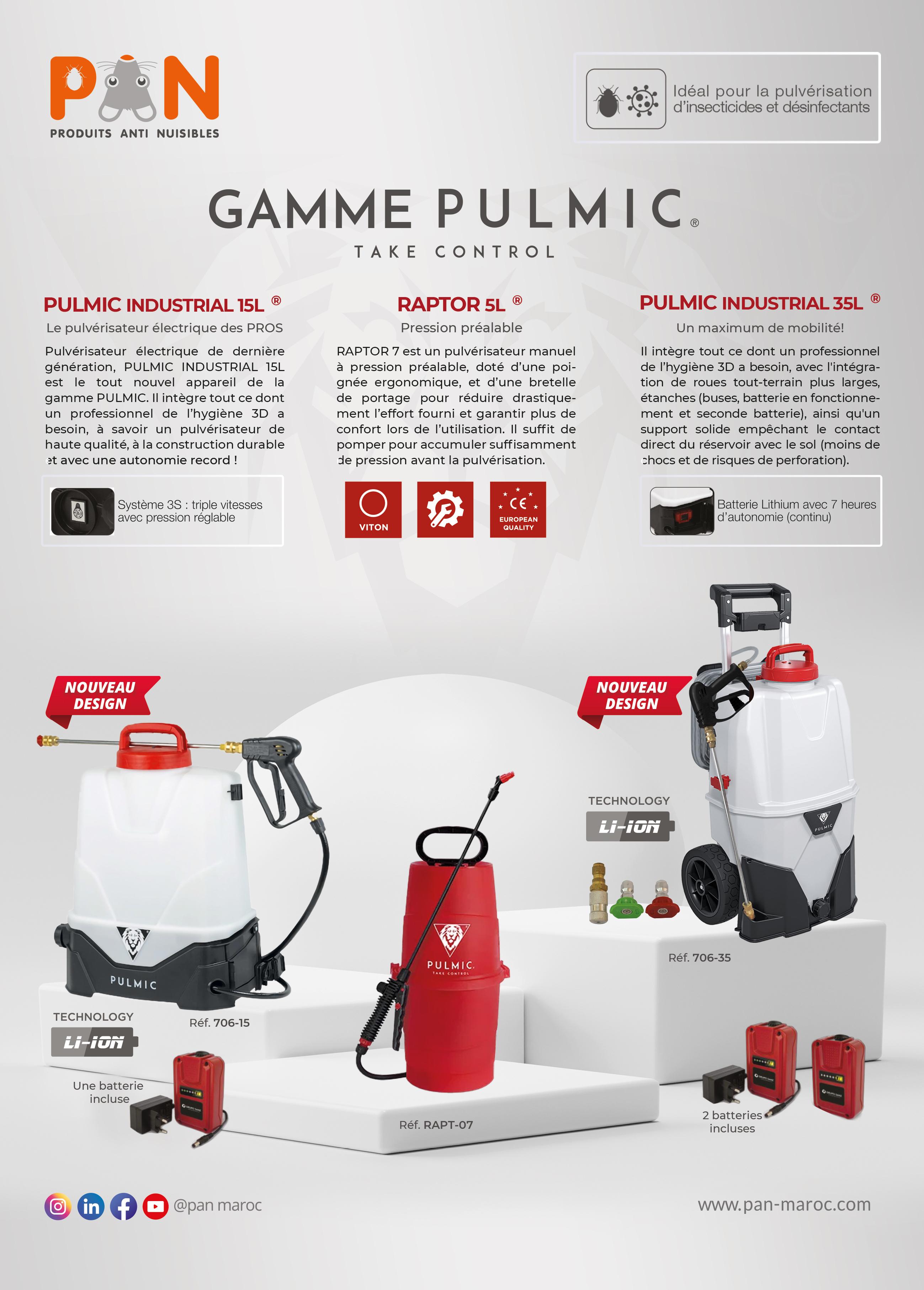 PULMIC INDUSTRIAL 15L est équipé d’une batterie Lithium amovible à haute autonomie (jusqu’à 7 heures en continu) et avec indicateur de charge restante. Ce pulvérisateur électrique est proposé dans une finition PREMIUM pour les professionnels : tuyau PVC renforcé, cuve et lance en polypropylène anti-choc, ainsi que joints Viton pour résister aux produits corrosifs.