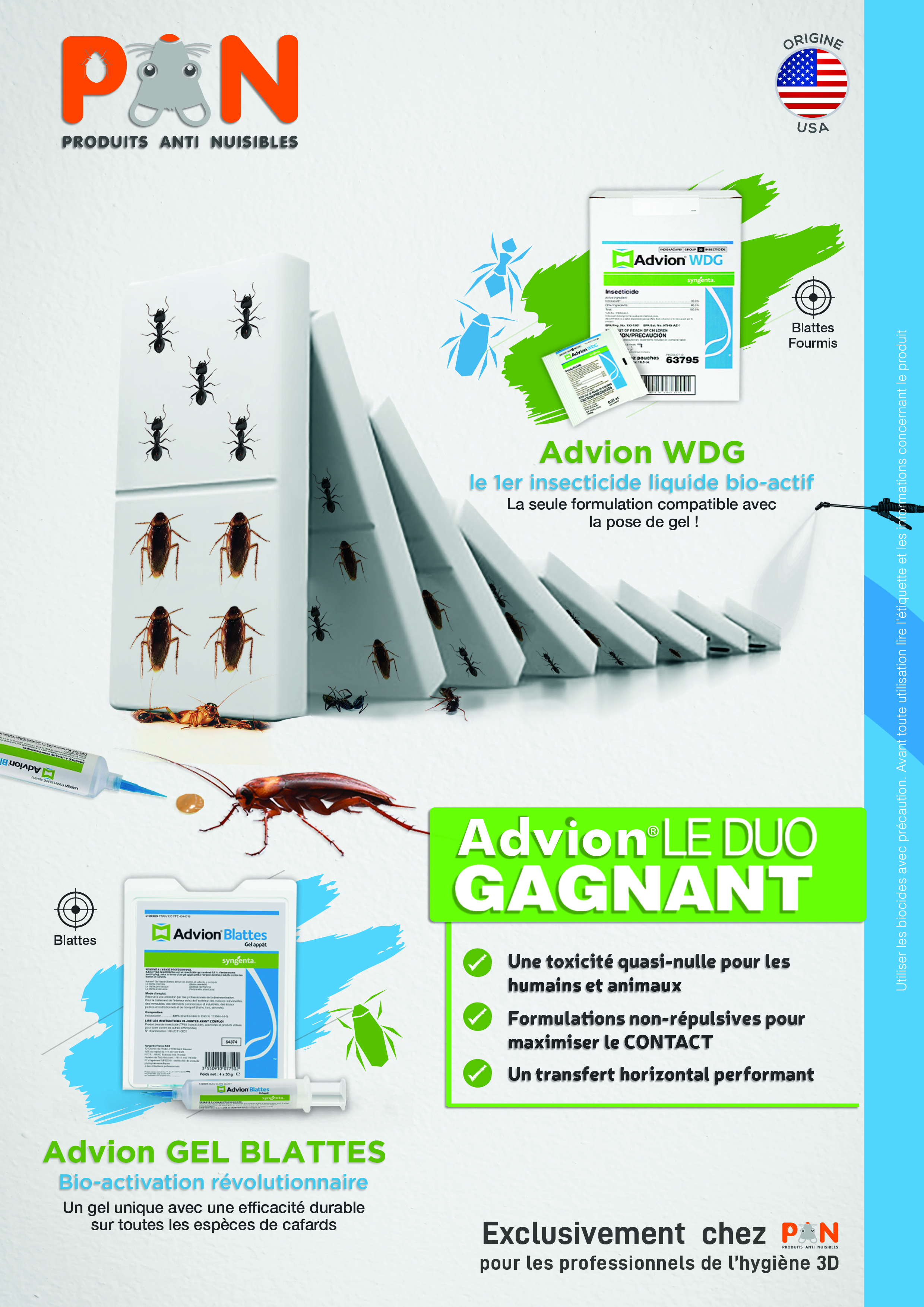 ADVION WDG est unique car il agit sur d’autres points sensibles pour combattre la résistance des nuisibles. Il n’est pas détectable par les insectes pour favoriser considérablement le contact et il permet pour la 1ère fois de combiner le gel cafards ou fourmis avec une pulvérisation ciblée de ADVION WDG dès le 1er passage !