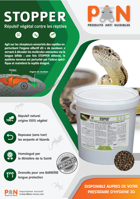STOPPER agit sur les récepteurs sensoriels des reptiles (serpents, certains lézards communs et geckos) en perturbant l’organe olfactif dit « de Jacobson » servant à décoder les molécules odorantes via la langue bifide : une fois STOPPER détecté, le système nerveux est perturbé par l’odeur spécifique et maintient le reptile éloigné.