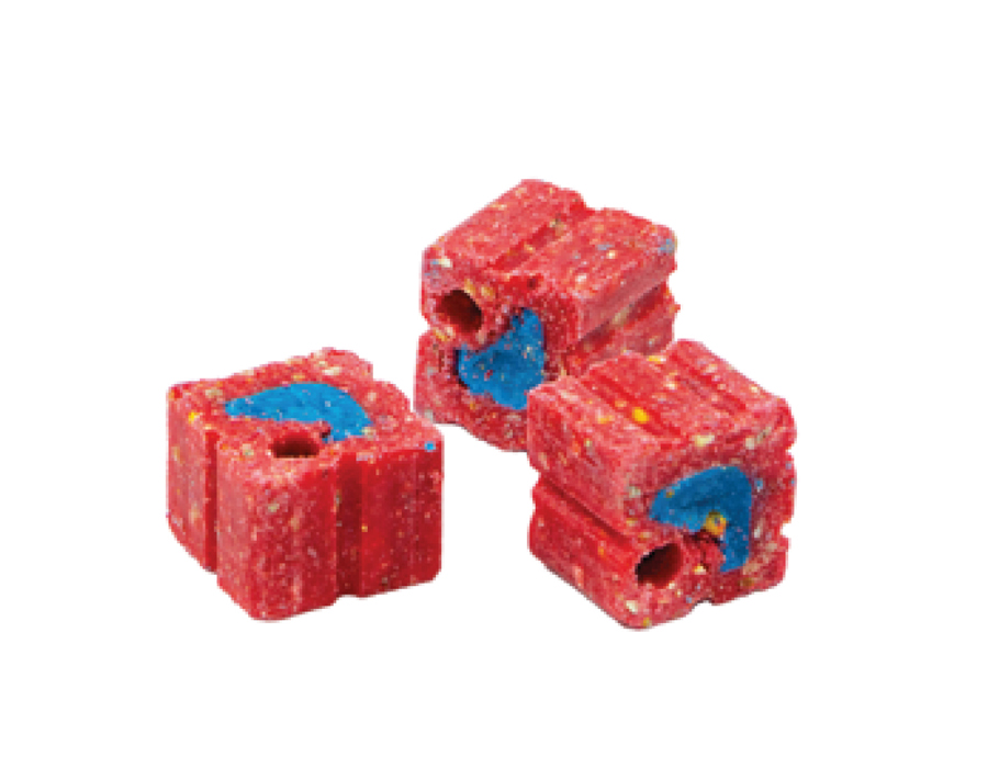 - Le bloc extrudé rouge constitue un enrobage appétent car il intègre des brisures de céréales pour encourager la consommation et l'acceptation par les rongeurs.