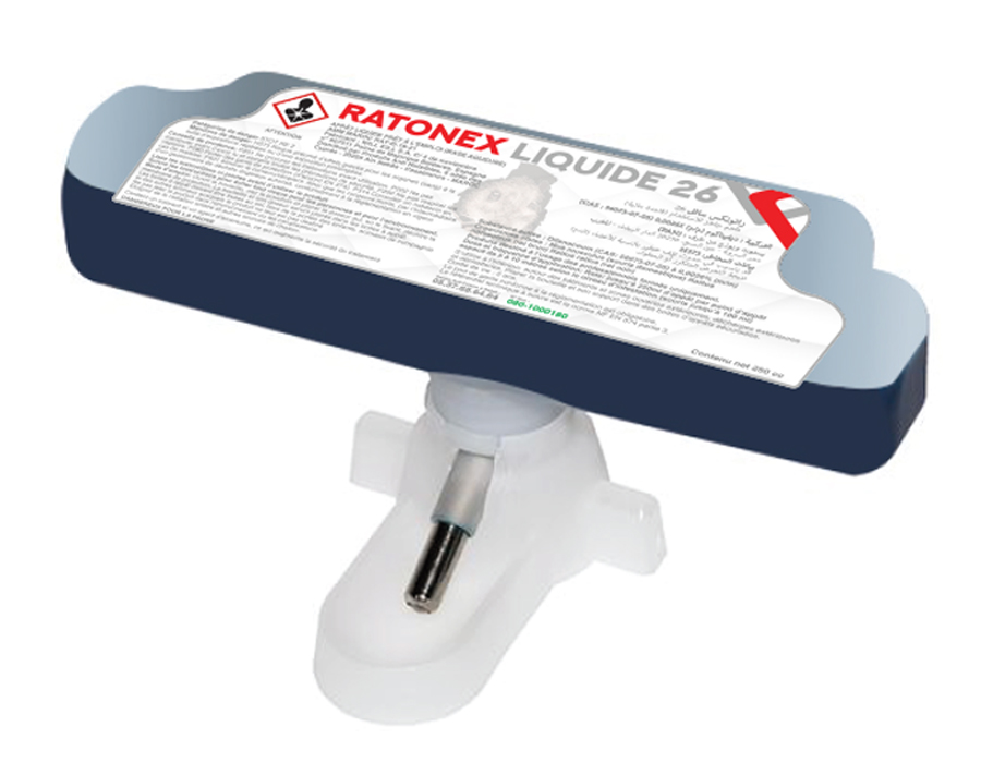 RATONEX Liquide est présenté dans un format flacon plastique solide avec une  pipette à bille servant d’abreuvoir sécurisé. Son installation doit se faire dans les postes d’appâtage sécurisés TOTAL BOX (version 100ml pour les souris) ou MASTERBOX PLUS (version 250ml pour les rats) afin de suivre la consommation et faciliter l’inspection. Peut egalement être installé dans d’autres postes d’appâtages sécurisés (selon tailles et modèles des postes).